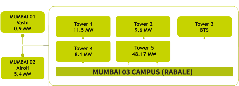 Sify's Rabale hyperscale data center campus is designed for up to 377+ MW IT capacity. The expandable mega campus, located at Navi Mumbai, is designed for 12 towers of which five are currently operational. Sify's Rabale campus also offers customers built-to-suit (BTS) options to customize and design a data center facility to meet their specific needs.